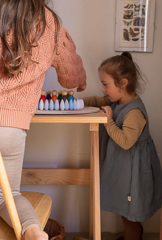 Veel gezinnen gebruiken houten figuren ook als decoratief en ritueel spelmateriaal. Op de seizoenstafel bijvoorbeeld – waar ze het verloop van het jaar, feesten of symboliek ondersteunen. Denk aan een boer in de herfst, een herder met schapen in de winter of een elfje in de lente. Zo krijgen de houten figuurtjes niet alleen een speelfunctie, maar ook een plek in het dagelijks ritme van het gezin.
