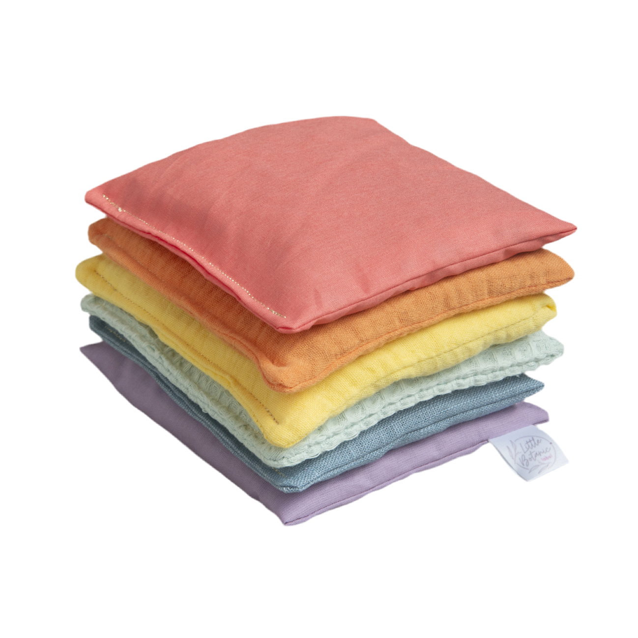 Deze set van zes handgemaakte pittenzakjes in zachte pasteltinten is perfect voor eindeloos creatief spel.