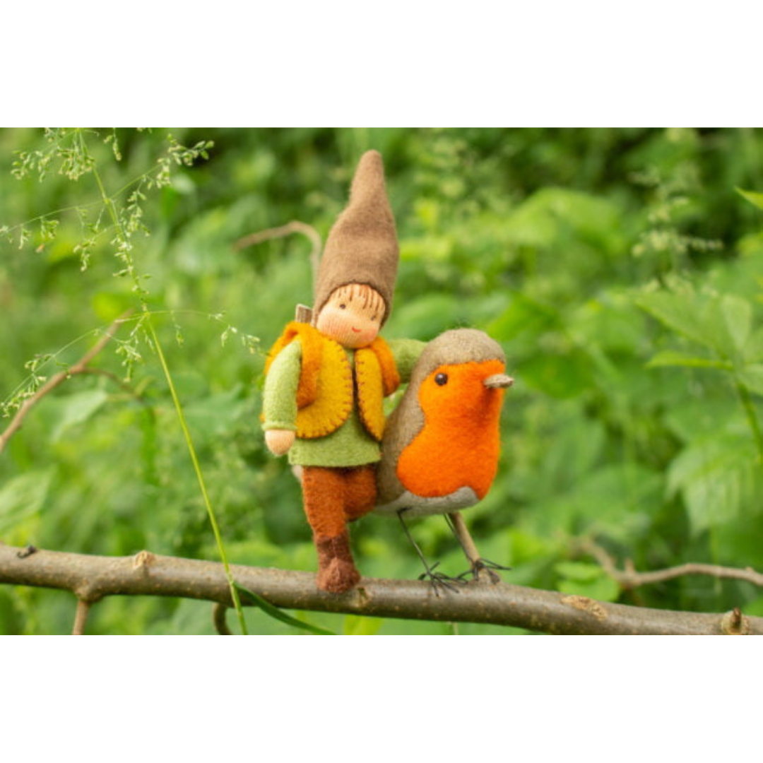 Hij deelt een bijzondere vriendschap met een nieuwsgierig roodborstje dat hem altijd opzoekt. De kabouter, zonder zijn puntmuts, is 10 cm hoog, terwijl het roodborstje ongeveer 7 cm hoog en 12 cm lang is.