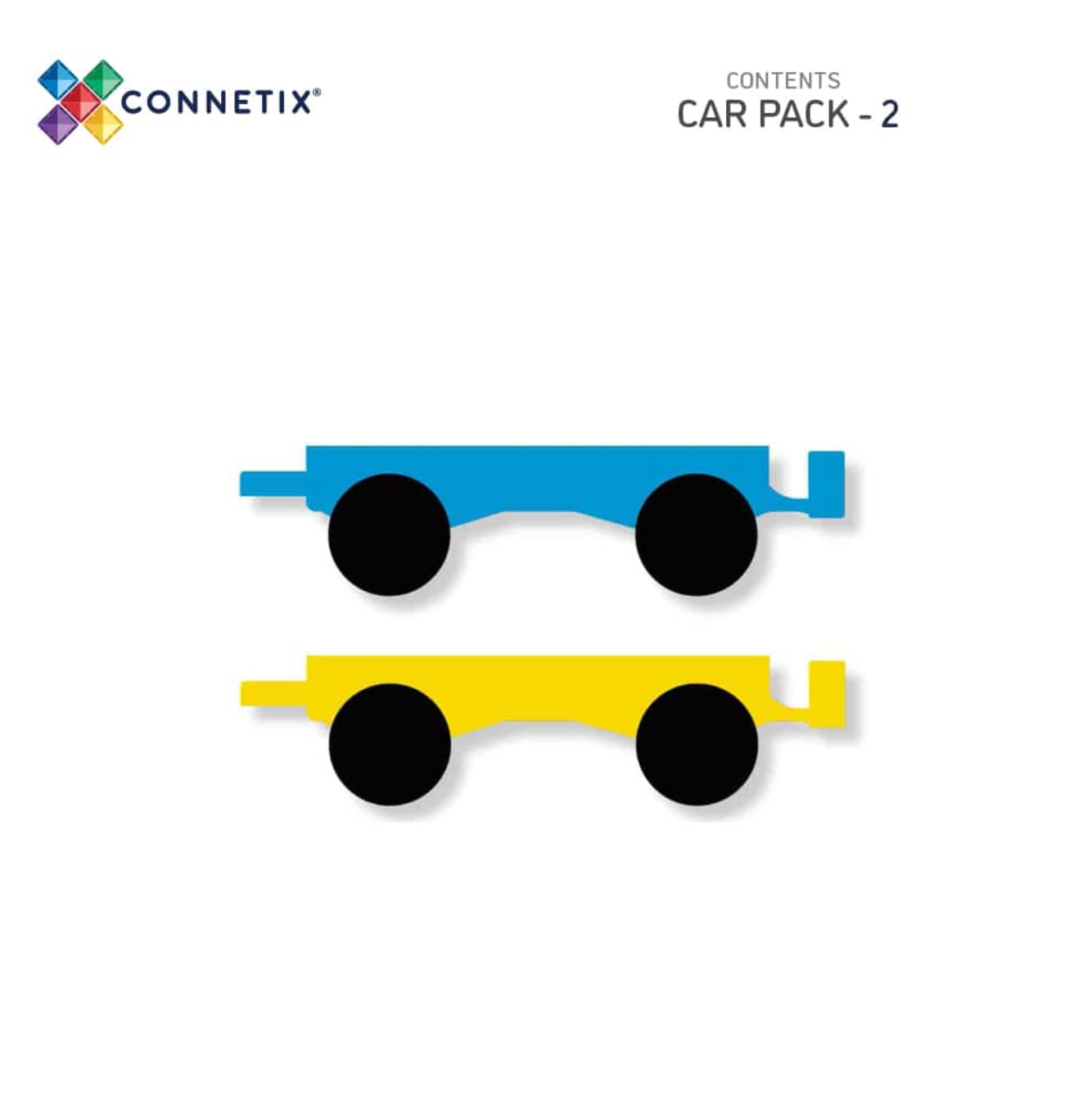 Het Auto Pack - Regenboog - 2 stuks van Connetix is een creatief speelgoedpakket dat bestaat uit een blauwe en een gele auto basis met een uniek ontwerp. Deze set is voorzien van ECHTE rubberen wielen en een speciale afschuining.