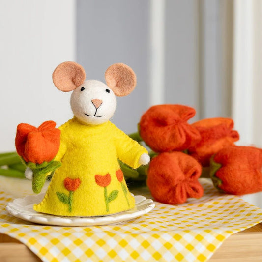 Decoratie muis van wolvilt - Geel met oranje tulp