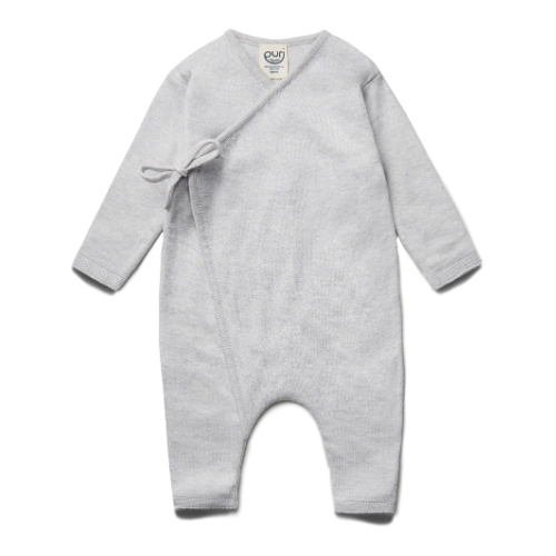 Dit lichtgrijze overslag boxpakje in katoen/zijde is het perfecte eerste kledingstuk voor je pasgeboren baby.