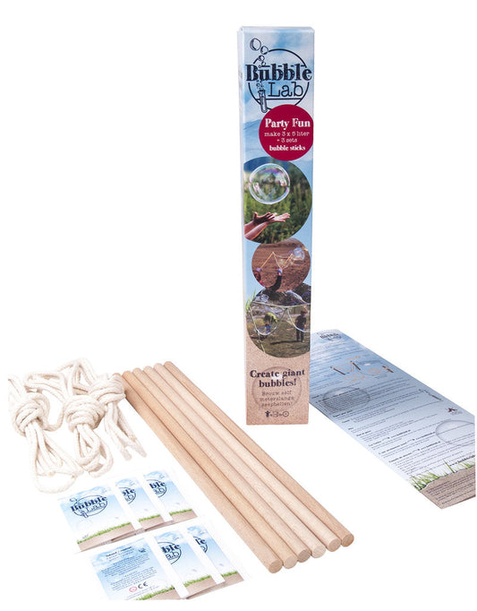 Met BubbleLab's poeder maak je zelf eenvoudig 5 liter sop en met het touw en de stokjes knoop je een mooie bubblestok waarmee je gigantische meterslange zeepbellen kunt toveren. Ideaal voor een middag vol spel en verwondering. Onze handleiding is beschikbaar in vier talen: Nederlands, Duits, Frans en Engels.