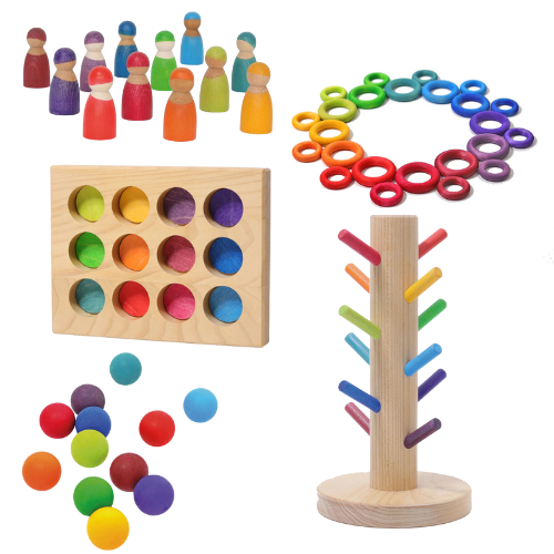 Deze bundel combineert vijf prachtige houten speelgoeditems van Grimm's, perfect afgestemd op open-ended spel en het ontwikkelen van fijne motoriek, kleurherkenning en creatief denken.