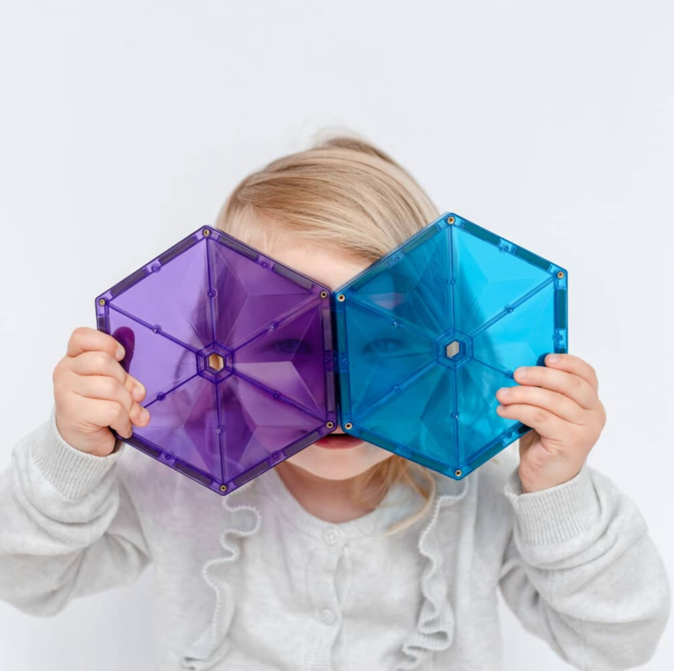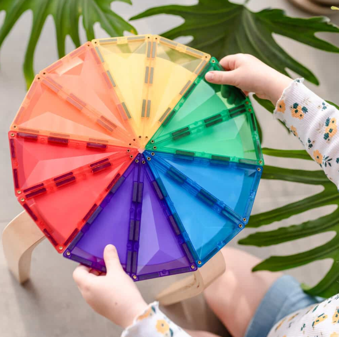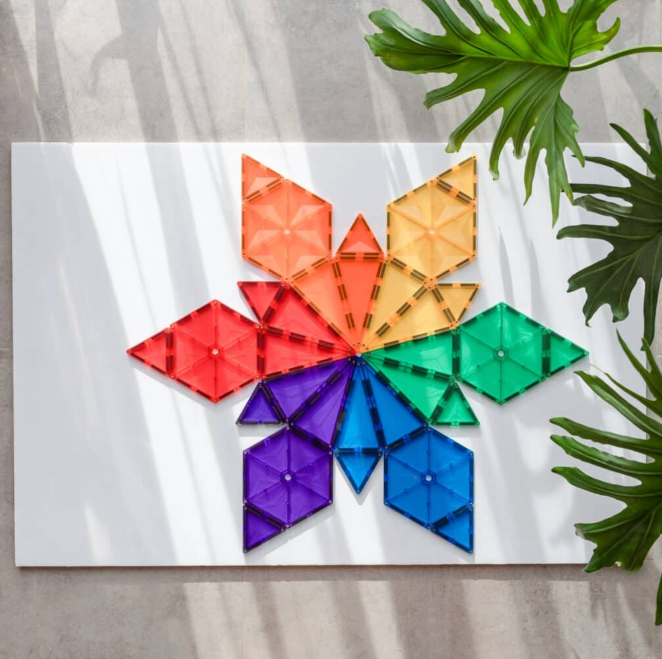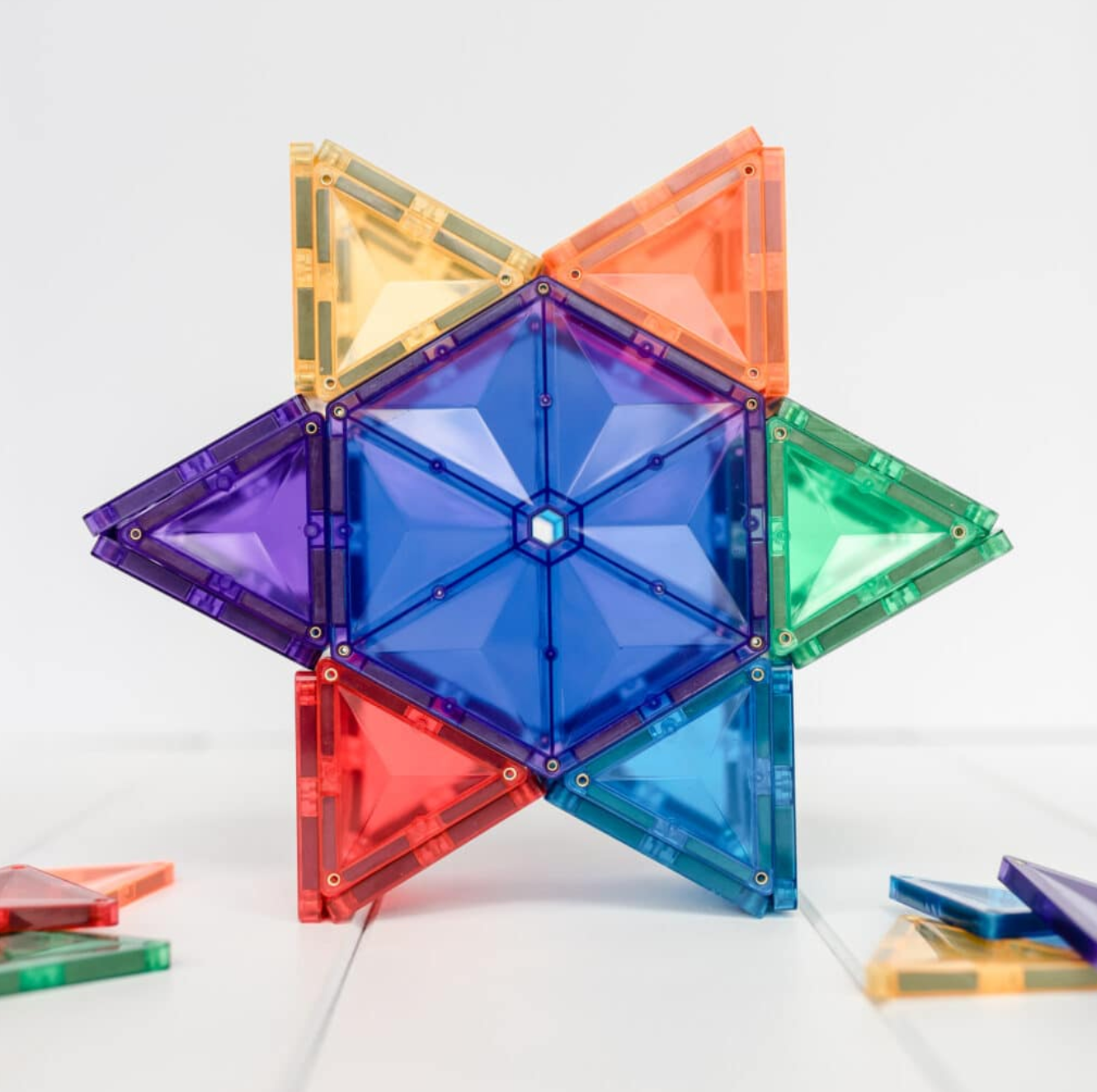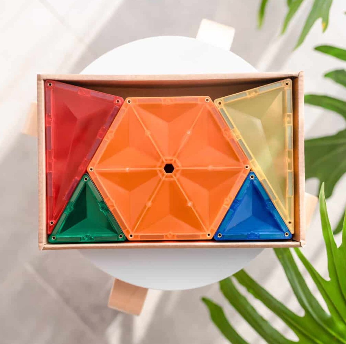 Met de bijgeleverde regenboogkleurige zeshoeken en driehoeken kunnen ze patronen, piramides, pizza's, mandala's en nog veel meer creëren.