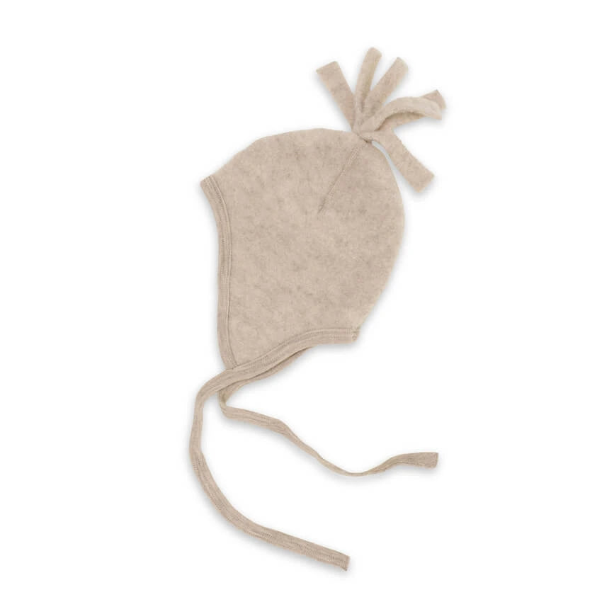 Ontdek ons knusse strikmutsje van 100% biologische wolfleece.