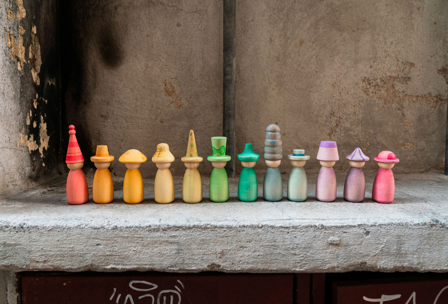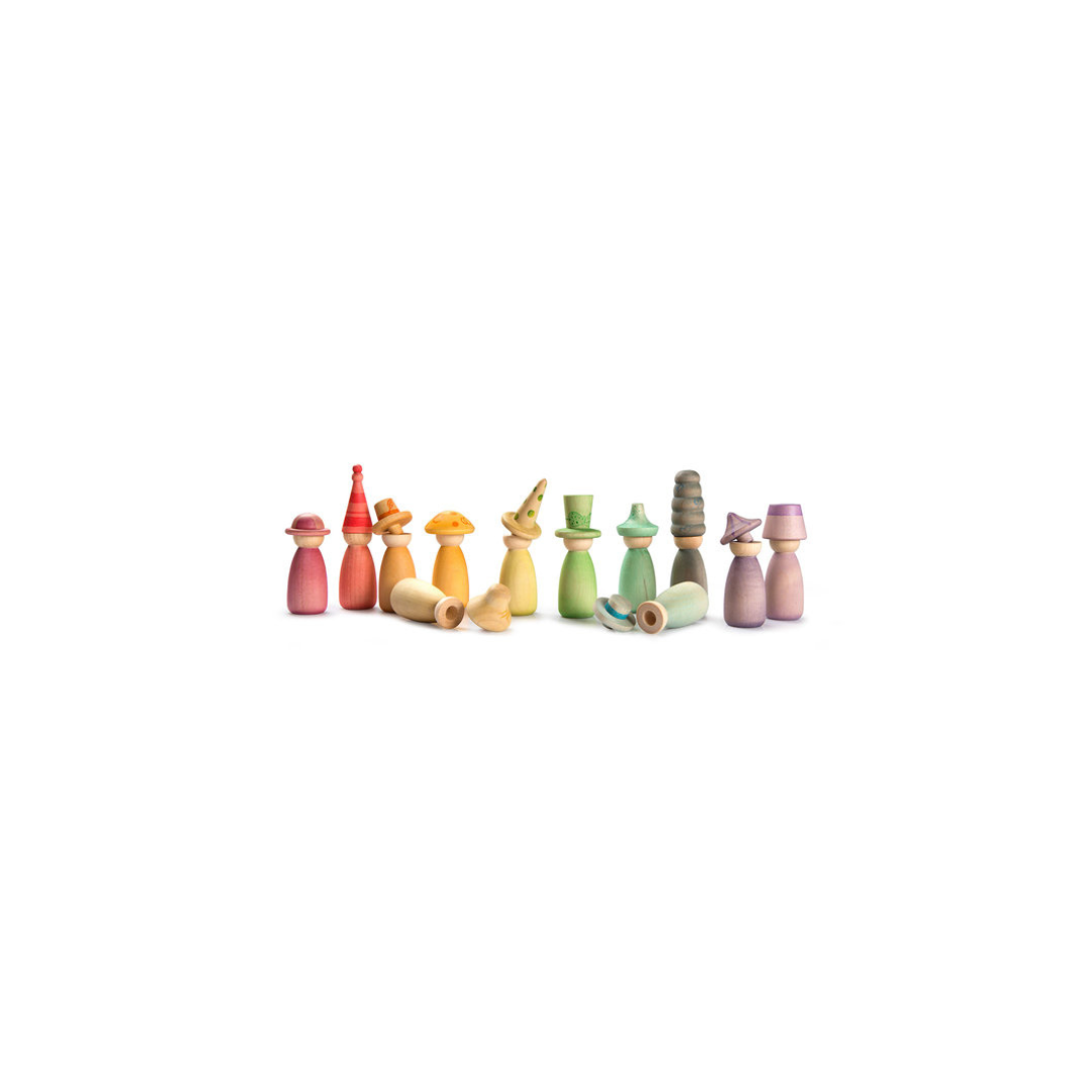 De set bevat 12 Nins met de hand geverfd in onze 12 kenmerkende regenboogkleuren, compleet met verwisselbare hoeden en lichamen voor eindeloze combinaties van kleurrijke mogelijkheden bij elk open-ended speelavontuur.