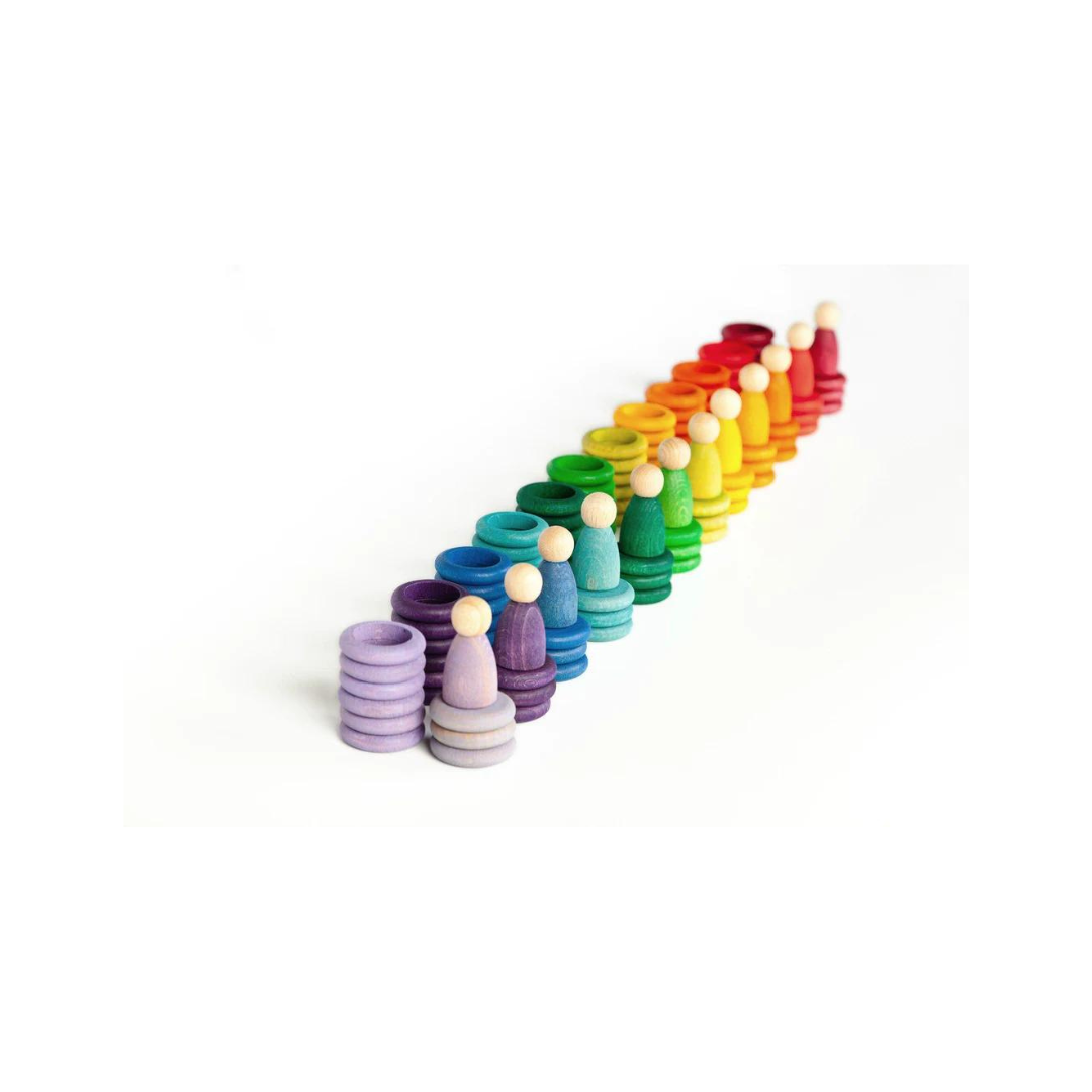 Dit kleurrijke spel bevat 12 Nins, 72 ringen en 36 munten in de tinten van de regenboog. Het wordt geleverd in een textielen zak met stof die het GOTS-certificaat heeft. Dit spel stimuleert de ontwikkeling van logisch-mathematisch denken door het classificeren, groeperen en matchen van elementen op basis van kleur en/of vorm.