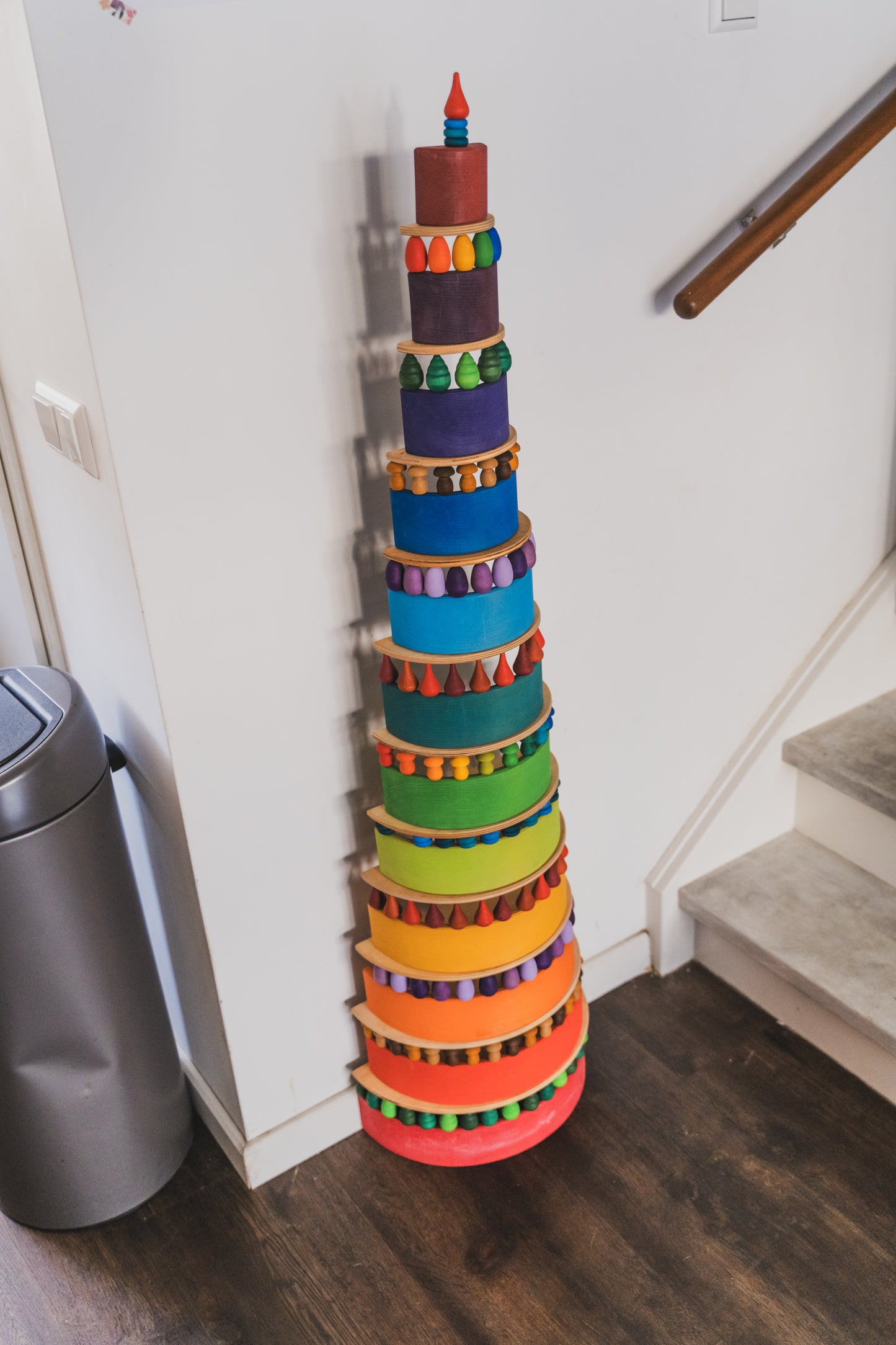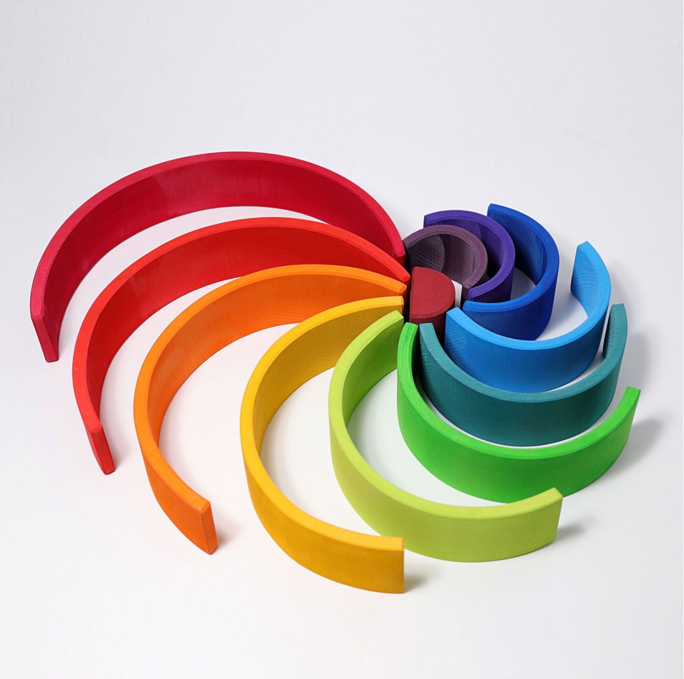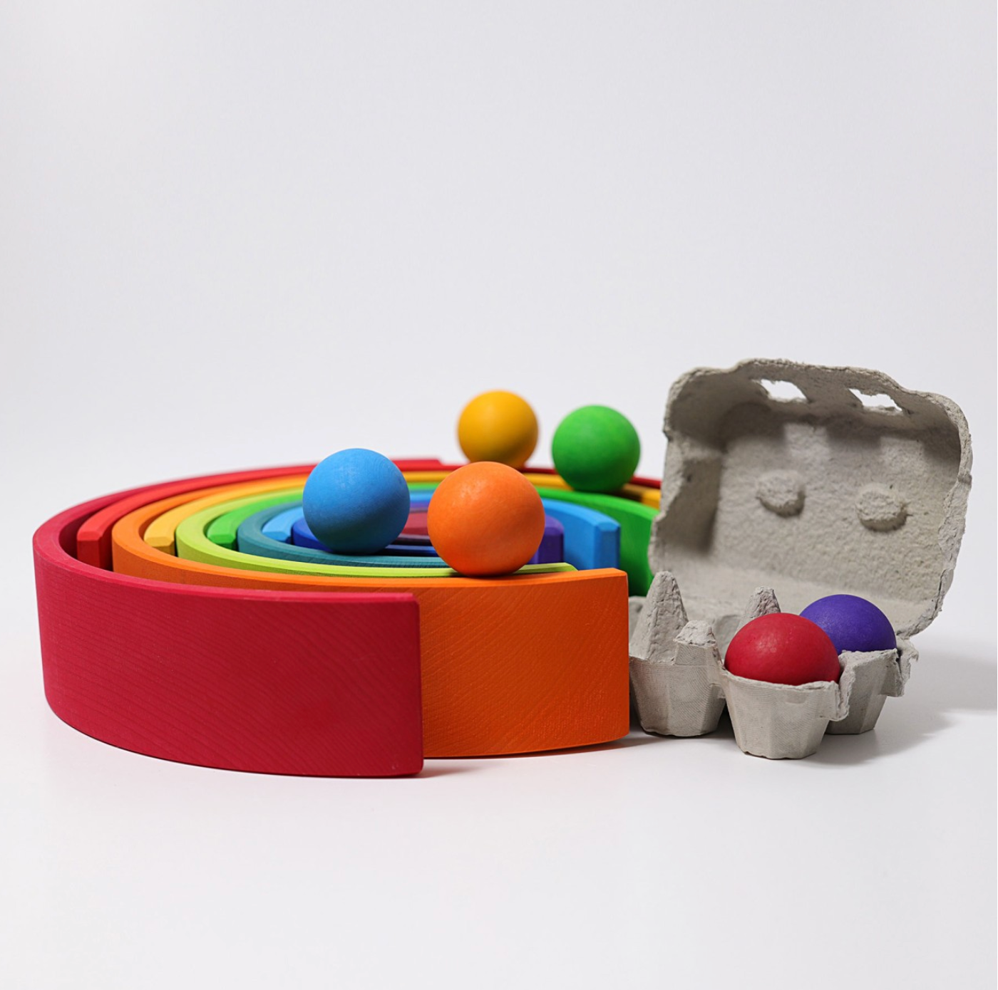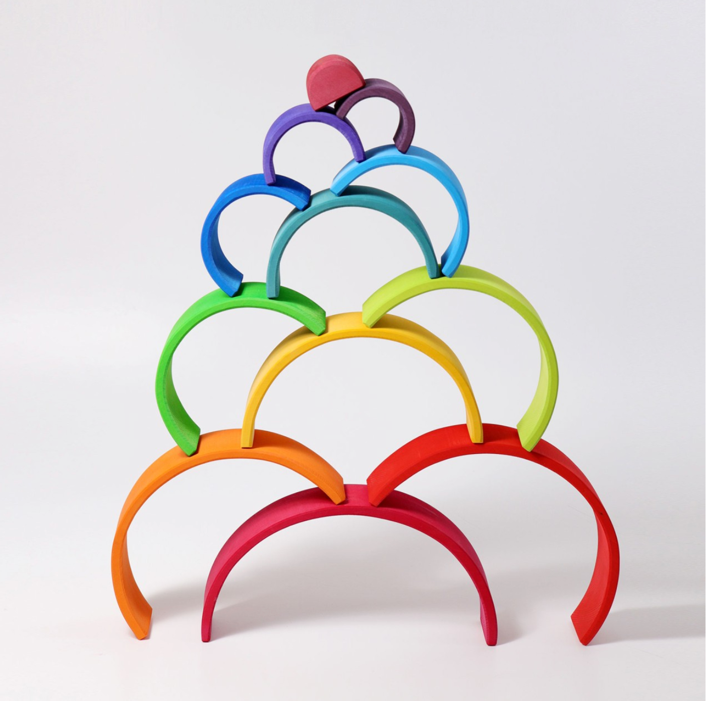 Mooie regenboog. Wordt door mijn dochtertje van 2,5 jaar iedere dag mee gespeeld. Torens maken, bruggen over de treinbaan of met balletjes er onderdoor rollen. Aanrader!