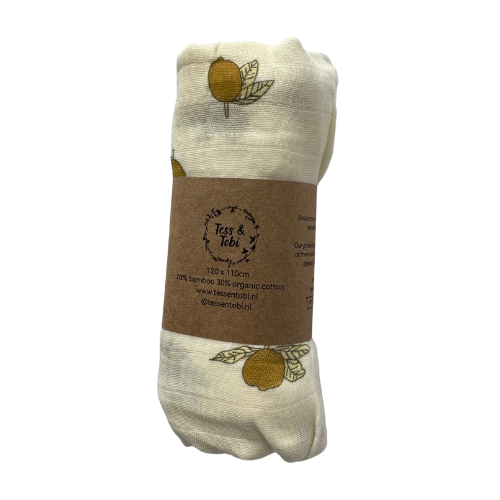 Deze ruime en zachte hydrofiele doek met een lief printje van kleine citroentjes in neutrale kleuren is een echte must-have voor iedere ouder. Het ontwerp is subtiel en basic, perfect voor wie houdt van eenvoud en natuurlijke tinten. Dankzij het royale formaat van 120 x 110 cm is deze XL doek multifunctioneel inzetbaar vanaf de allereerste momenten met je baby.
