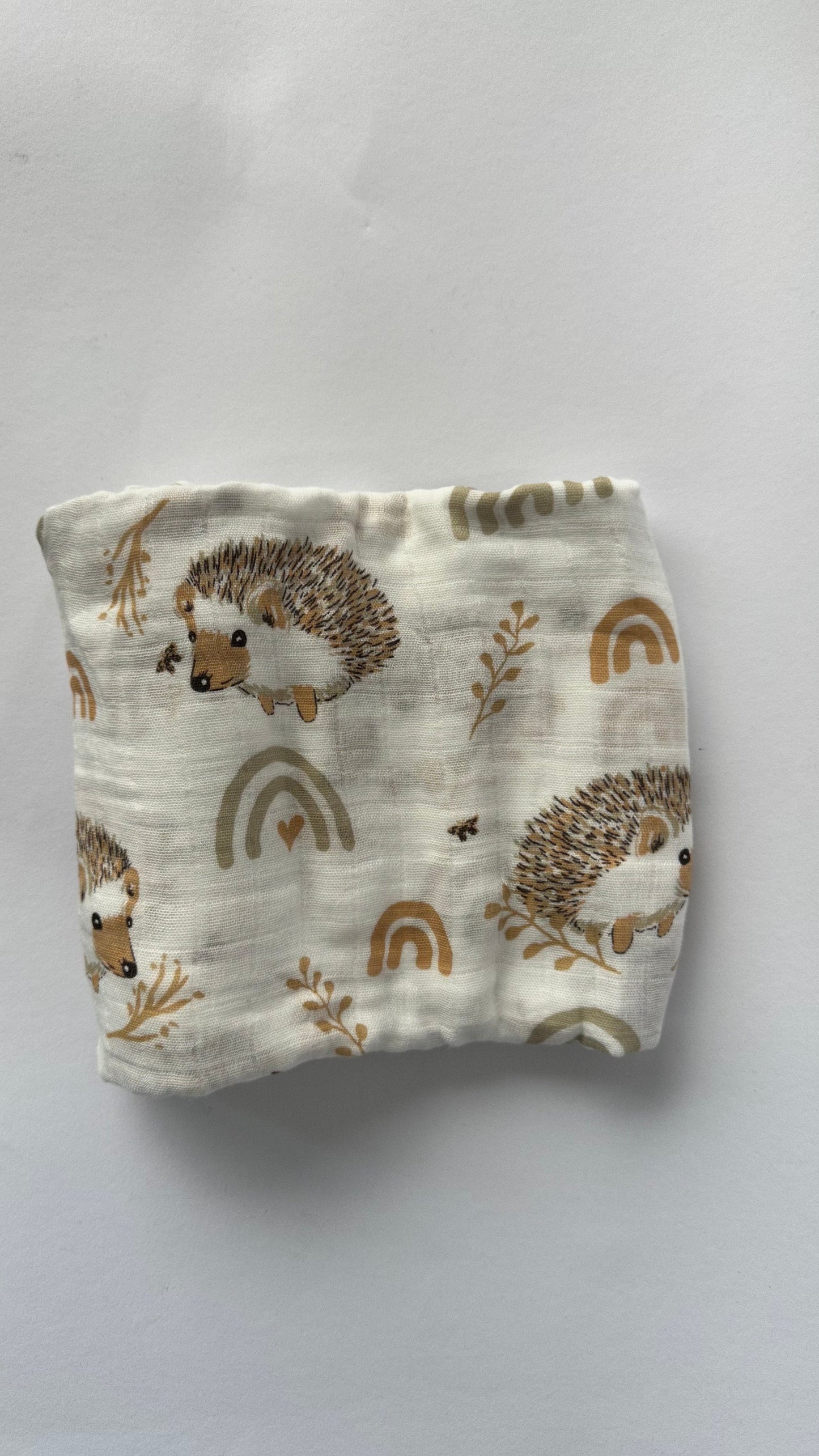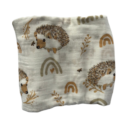 Deze XL hydrofiele doek is voorzien van een schattige print met egeltjes en regenboogjes, uitgevoerd in zachte aardetinten zoals beige, roestbruin en zand. De natuurlijke kleuren en het dromerige design maken deze doek een kalme, sfeervolle toevoeging aan je babyuitzet – perfect voor ouders die houden van rust, warmte en een vleugje speelsheid.