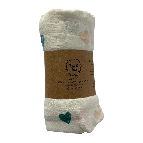 De gekleurde hartjes geven een speelse knipoog aan deze praktische klassieker. De doek is met zorg vervaardigd uit natuurlijke en huidvriendelijke materialen, voor het welzijn van je kindje én het milieu.