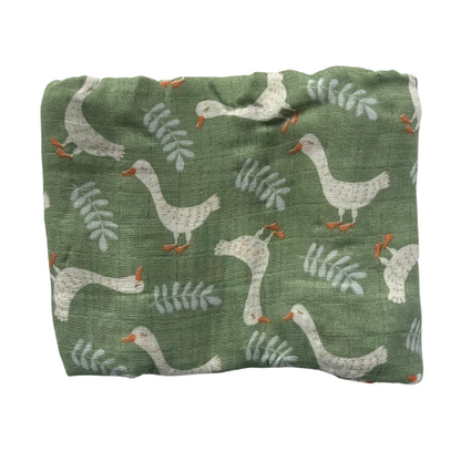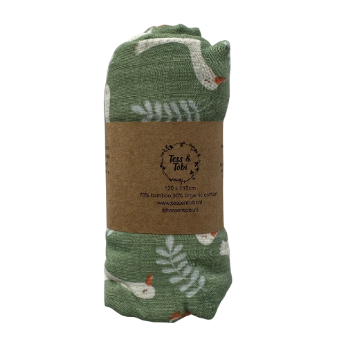 Deze ruime en zachte hydrofiele doek heeft een vrolijke en speelse uitstraling dankzij het groene printje met kleine gansjes. Net een tikkeltje minder basic, maar nog steeds stijlvol en helemaal geschikt voor dagelijks gebruik. Het royale formaat van 120 x 110 cm maakt deze XL doek tot een multifunctioneel item waar je als ouder niet zonder wilt.