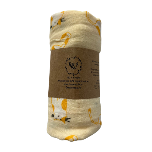Deze vrolijke XL hydrofiele doek is een echte eyecatcher dankzij de licht oranje ondergrond met een kleurrijke kattenprint. De speelse illustraties en levendige kleuren geven deze doek een vrolijk, expressief karakter – perfect voor ouders die houden van een beetje fun en fantasie in hun babyspulletjes.