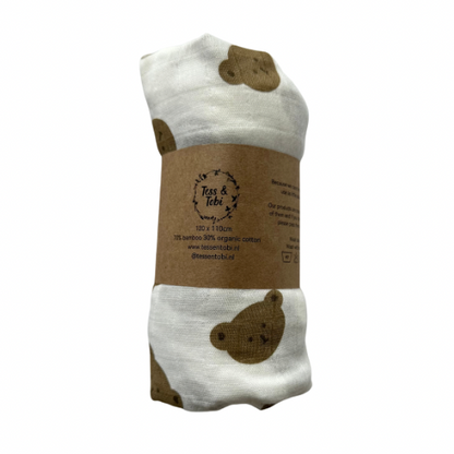 Deze extra grote hydrofiele doek is voorzien van een lief printje met bruine teddybeertjes in zachte aardetinten. Een rustige, neutrale uitstraling die perfect past in elke babykamerstijl – van minimalistisch tot natuurlijk. Het formaat van 120 x 110 cm maakt deze doek ideaal voor allerlei dagelijkse momenten met je kindje.