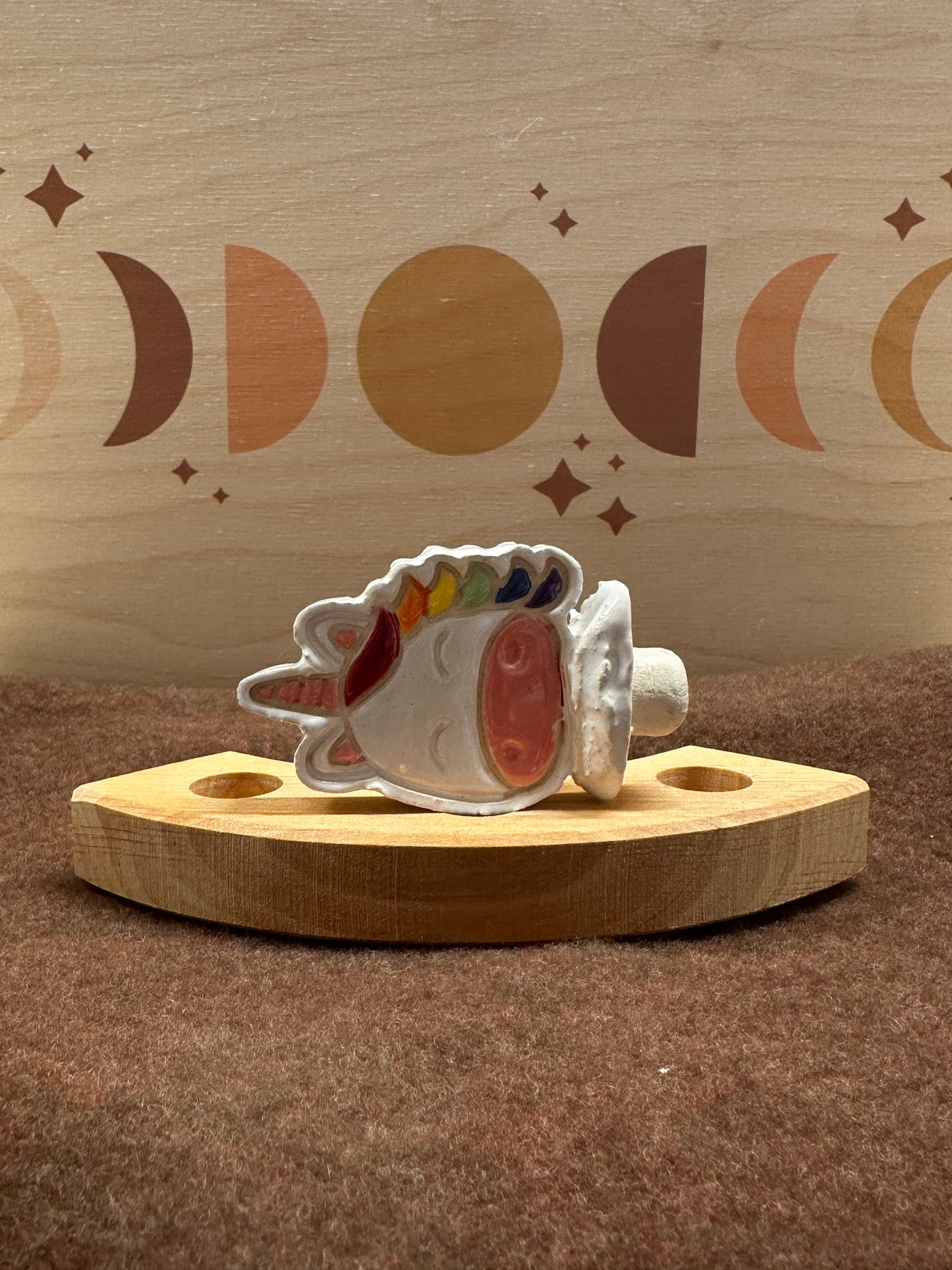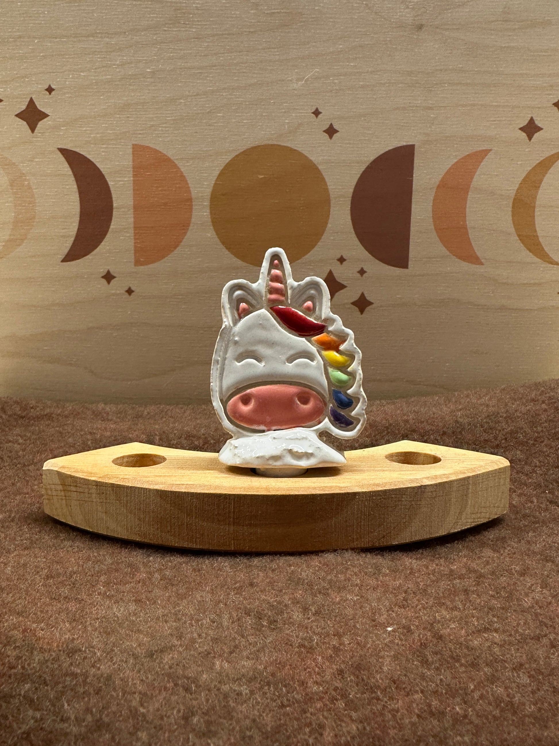Elke eenhoorn wordt met de hand gevormd door de makers van Lekker Sofisch in Zoetermeer, een dagbesteding waar ambacht en aandacht samenkomen. Het keramieken voetje zorgt voor een stabiele plaatsing in een standaard jaarring.