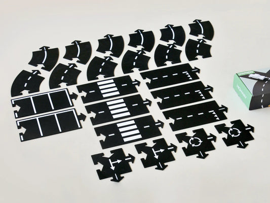De set bevat 16 bochten, 16 rechte baandelen, 4 kruisingen en 4 rotondes, waardoor kinderen hun eigen verbeeldingswereld kunnen creëren en combineren met ander speelgoed. De autobaan is gemakkelijk aan elkaar te leggen en te gebruiken op verschillende oppervlakken.