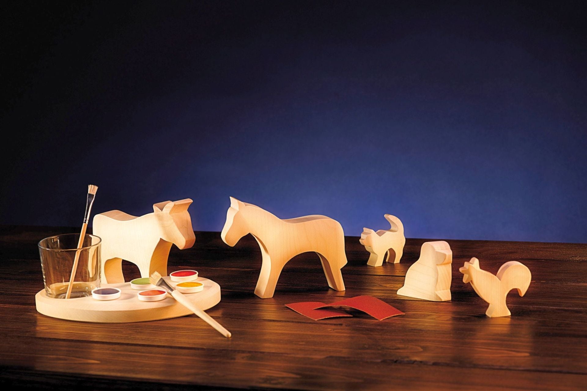 Inhoud: 1 paard, 1 koe, 1 haan, 1 hond, 1 kat (onbeschilderd, esdoornhout)