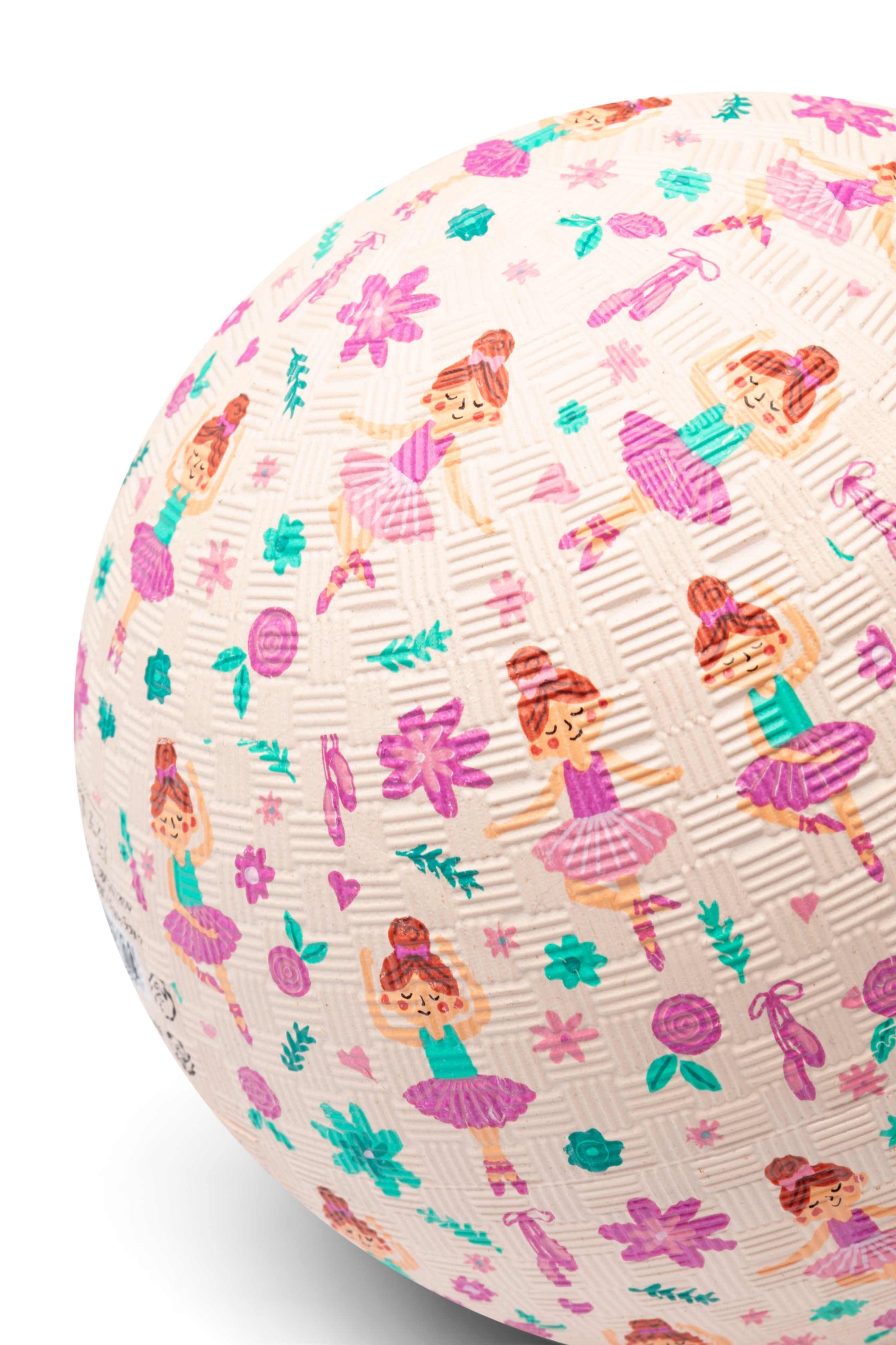 Deze sierlijke rubberen speelbal is versierd met elegante ballerina’s en tovert elke speelplek om tot een dansvloer.