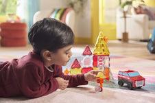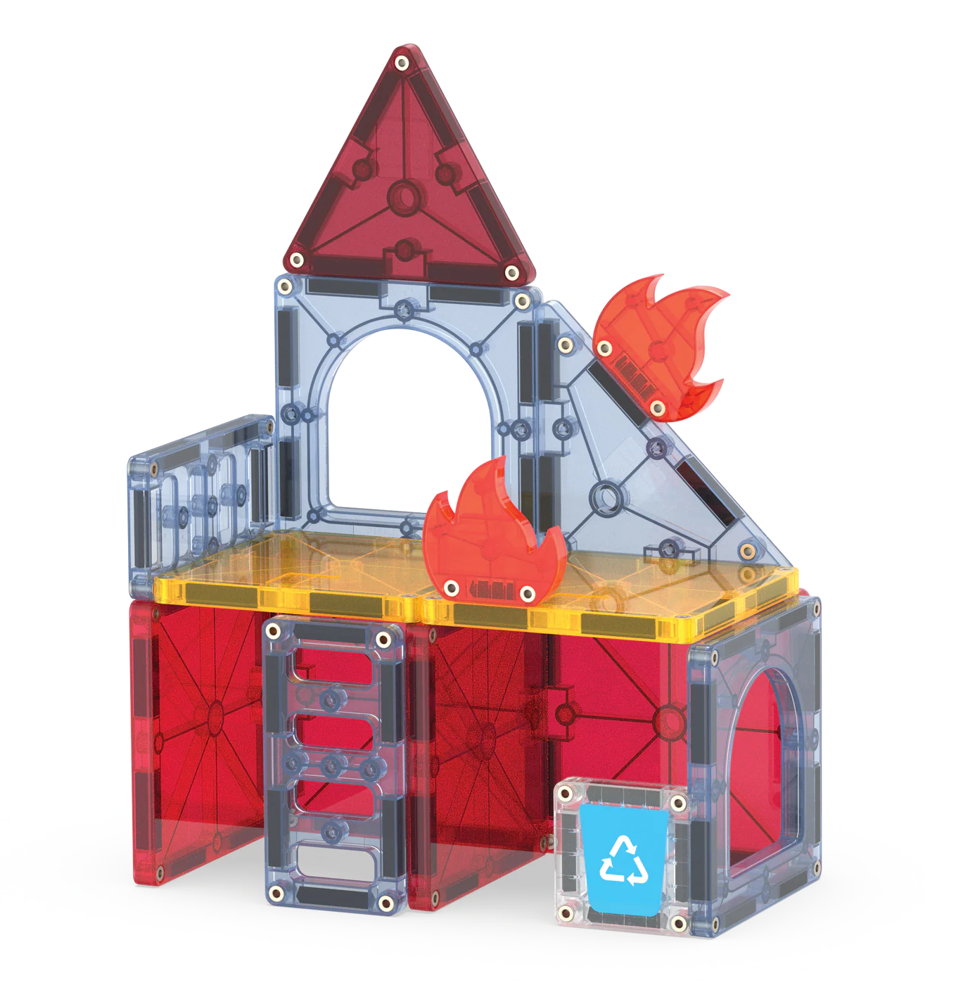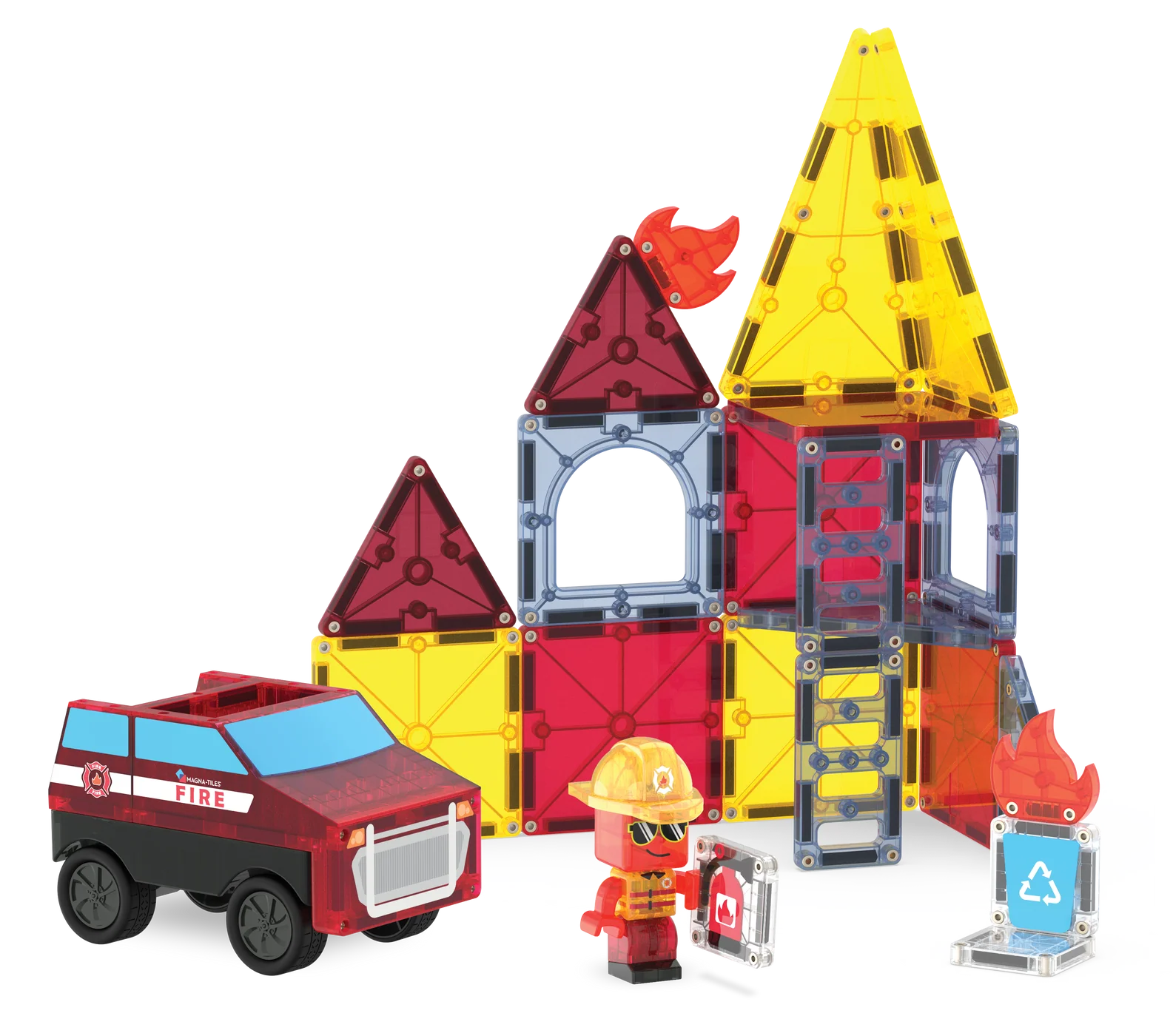 Met de Magna-Tiles Fire Rescue 27-delige set brandweer kunnen kinderen hun eigen reddingsverhalen bedenken.