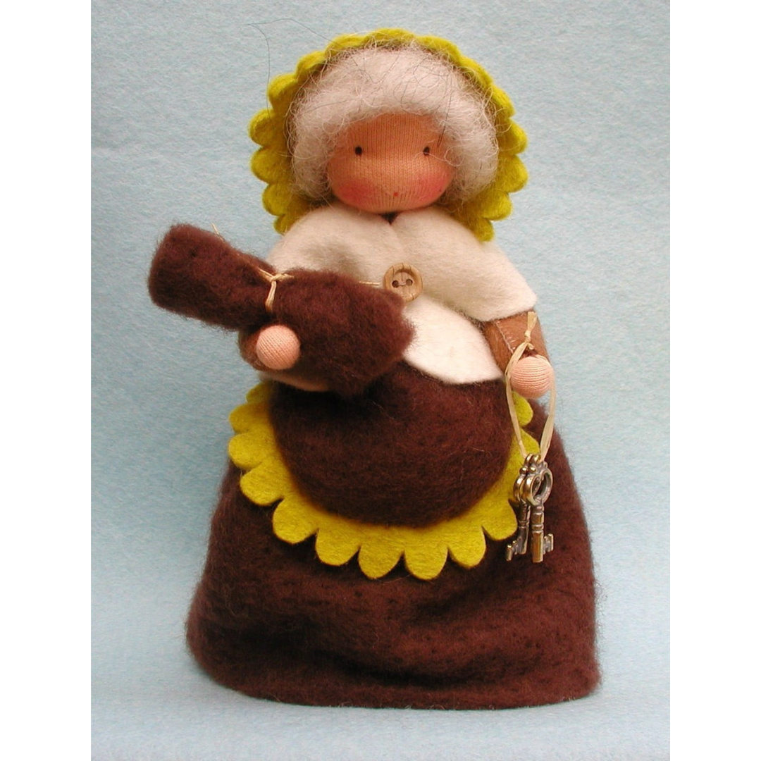 Moeder Aarde is niet moeilijk om te maken. In het pakket is wolvilt, fresco vilt en naaldvilt verwerkt. Op het vestje zit een lief houten knoopje. Om de poort naar de aarde te openen en te sluiten heeft ze twee sleutels bij zich. Met een dekentje wacht ze de bloemenkinderen op om straks lekker te gaan slapen tussen de wortels van de bomen. Ze is 17 cm hoog.