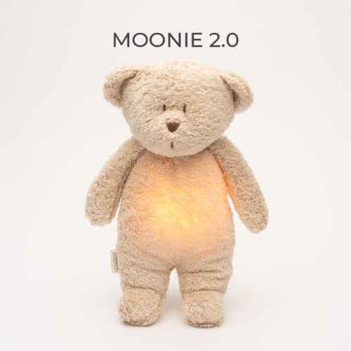 Moonie maakt rustgevende knuffels met natuurlijke white noise en een zacht nachtlampje.