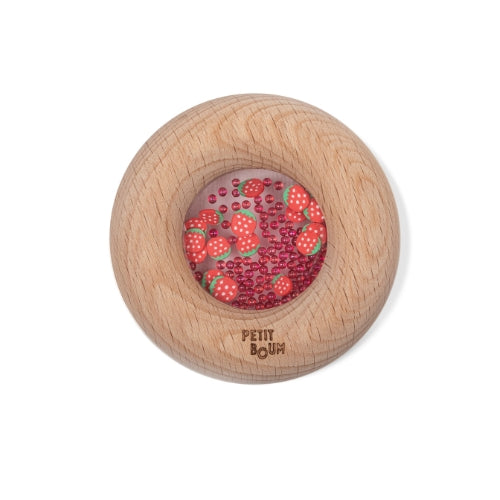 Binnenin dwarrelen kleine aardbei-illustraties vrolijk in het rond terwijl ze een rustgevend, rammelend geluid produceren.
