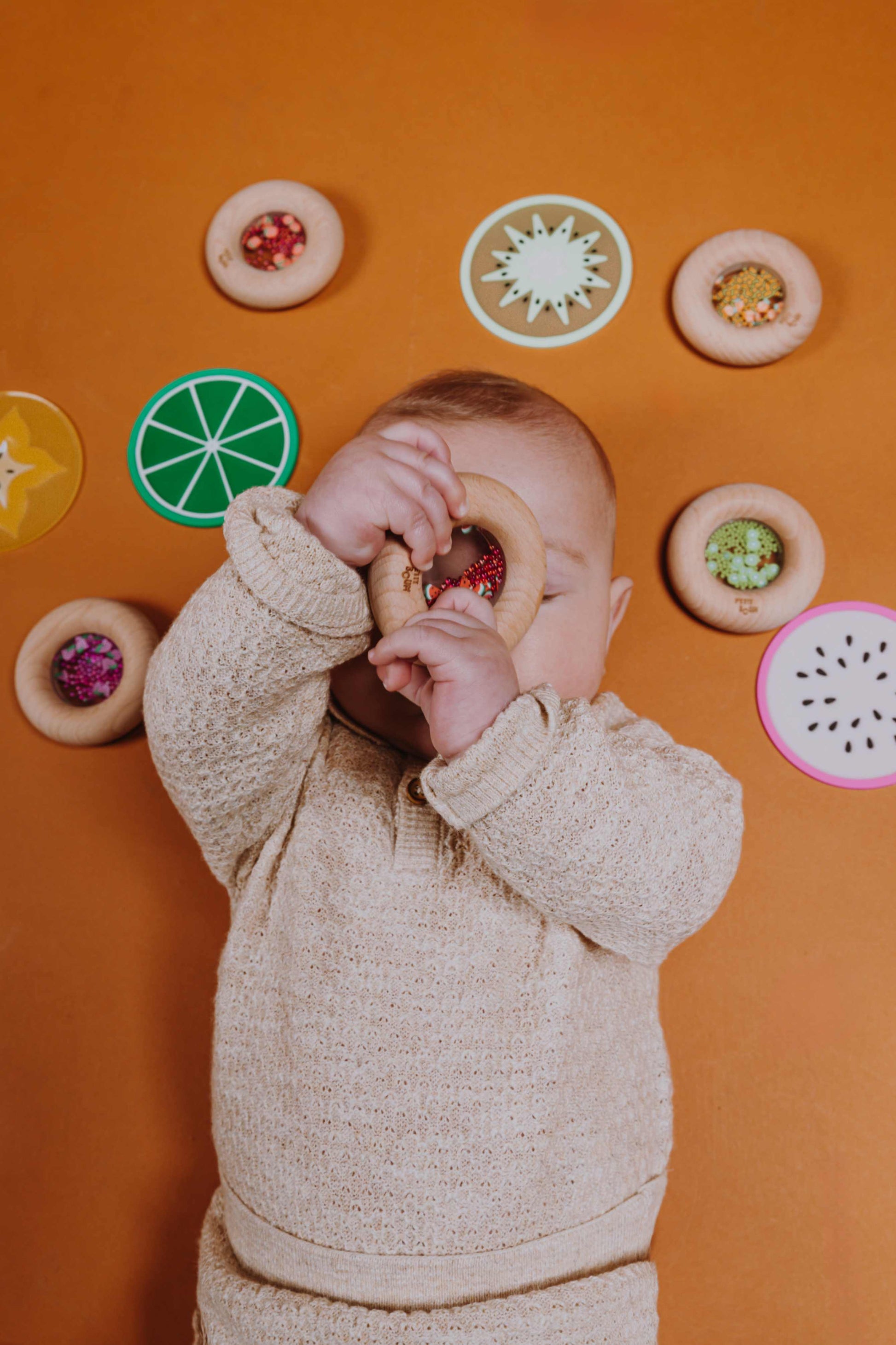 De sensorische donut kiwi’s is het perfecte speelgoed voor nieuwsgierige handjes, scherpe oogjes en gevoelige oortjes.