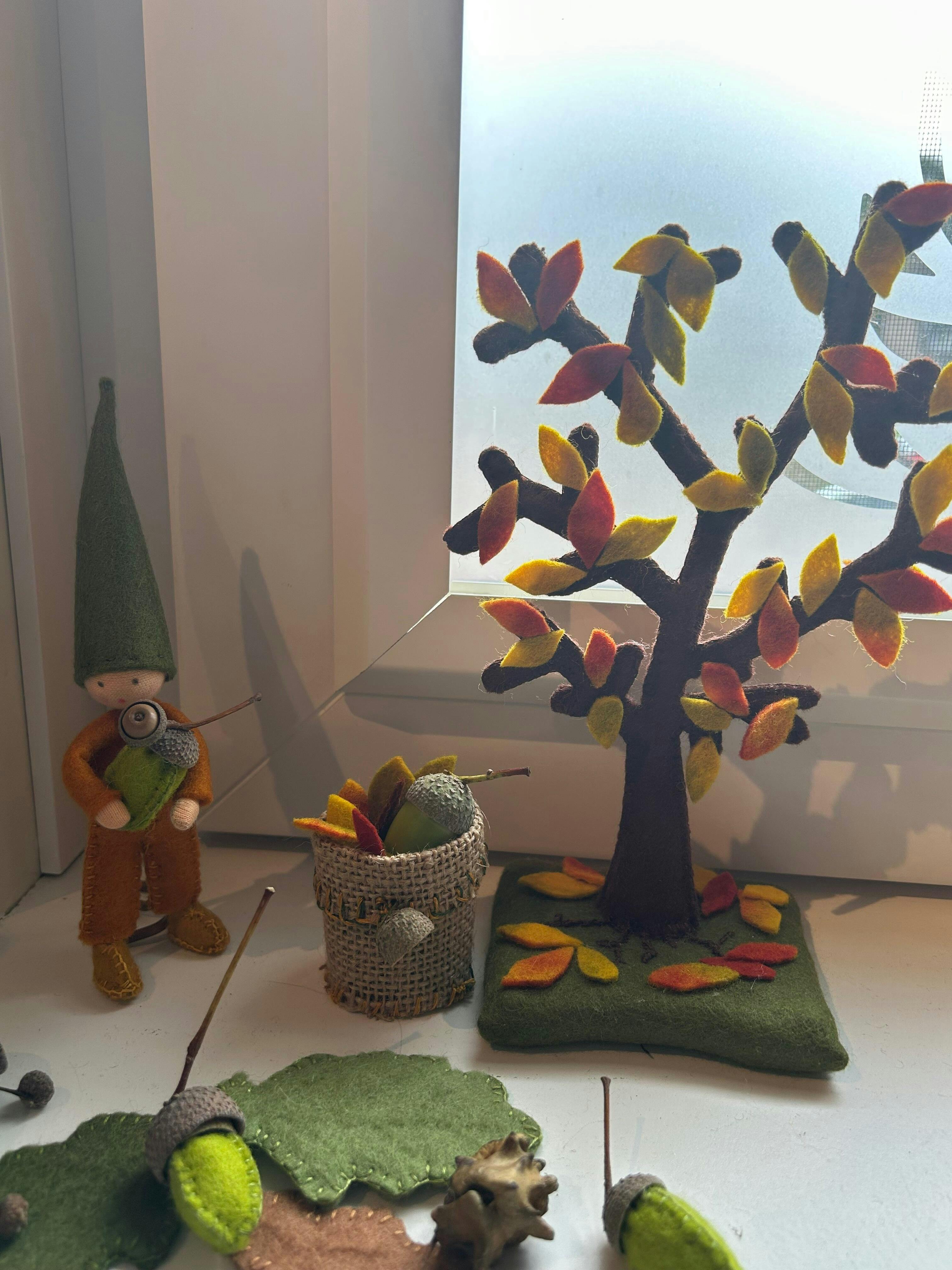 en betoverende herfstboom met schitterende bladeren gemaakt van zacht wolvilt. Onder de boom staat een mandje van natuurlijk jute, waarin charmante paddenstoelen groeien. Met een vleugje creativiteit en enkele eenvoudige aanpassingen verandert deze boom moeiteloos in een winter, lente of zomerboom. Met een hoogte van 21 cm is deze boom een onmisbare toevoeging aan jouw herfsttafel. Geniet van het seizoen in stijl met deze prachtige decoratie.