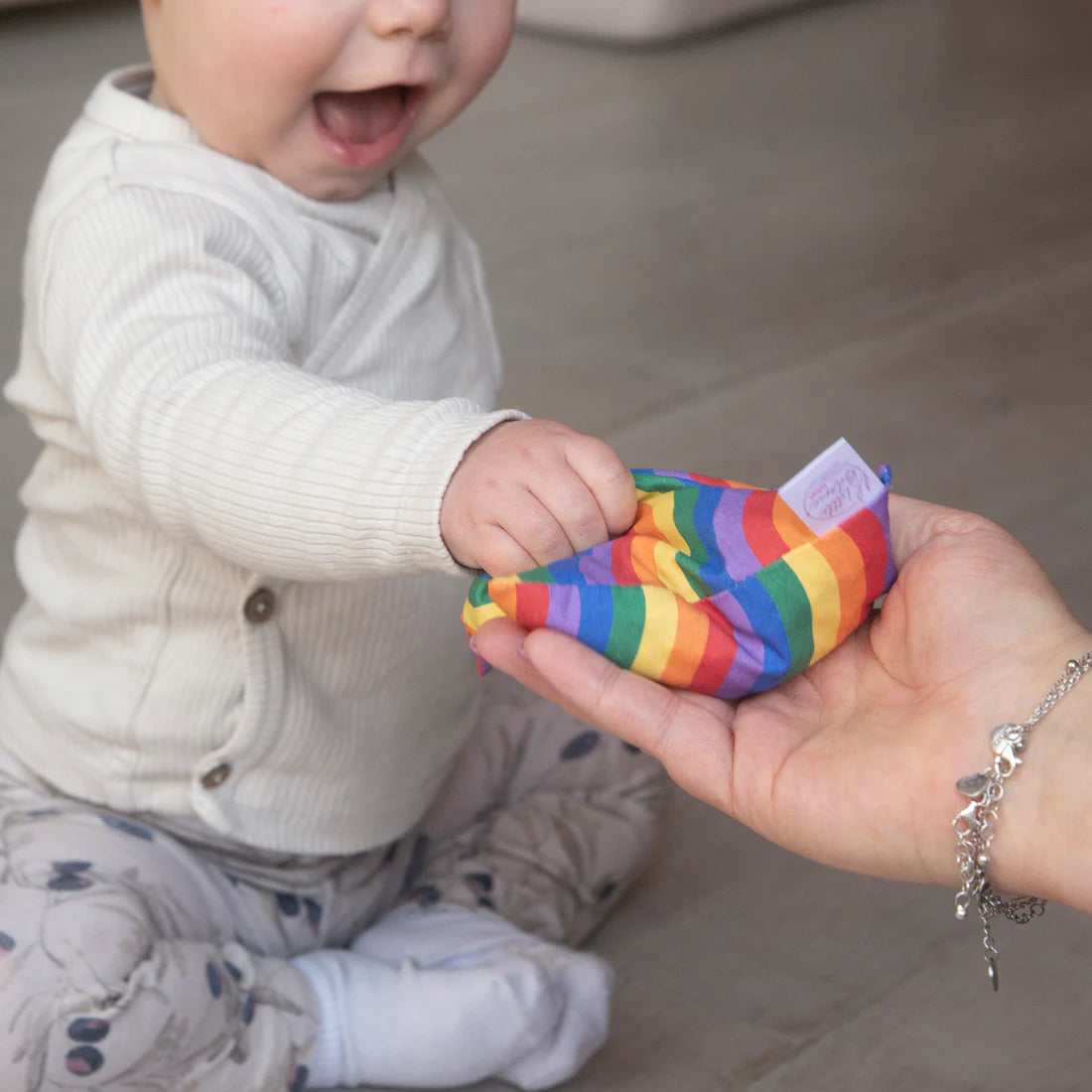 Met het speelse waves patroon en vrolijke regenboogkleuren is dit sensorisch pittenzakje waves regenboog onweerstaanbaar voor kleine handjes.