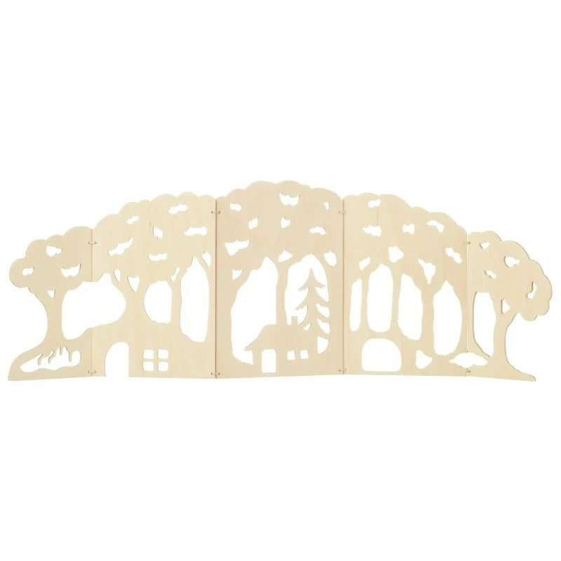 Deze kleine uitvoering van het geliefde bosrandje laat een speels silhouet zien van bomen en bosvormen, zorgvuldig uitgesneden uit dun hout.