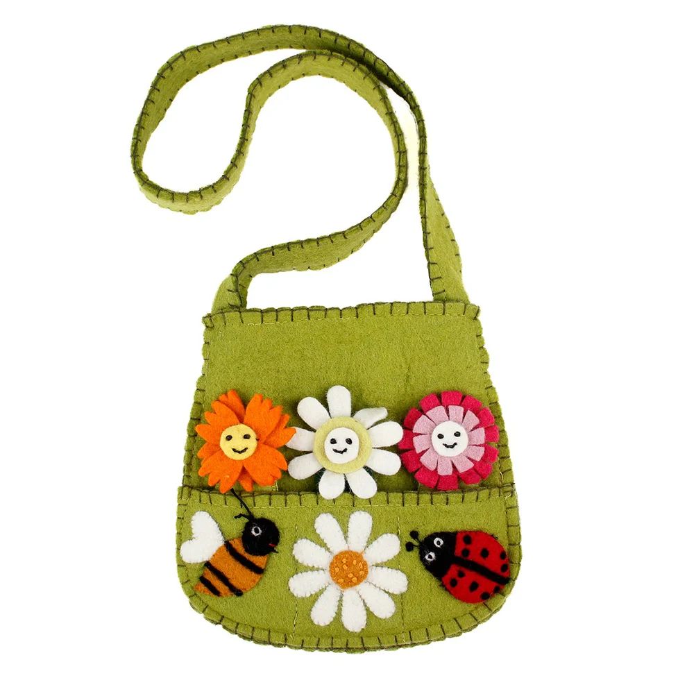 Dit vrolijke vilten tasje bevat drie vingerpopjes van verschillende bloemen en is perfect voor fantasierijk spel.