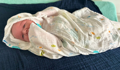 Ontdek onze liefdevol ontworpen XL hydrofiele doek met een schattig printje! Met een royale afmeting van 120 x 110 cm is deze doek perfect voor het inbakeren van je baby. Gemaakt van 70% bamboe en 30% biologisch katoen, biedt het de ideale mix van zachtheid en duurzaamheid.