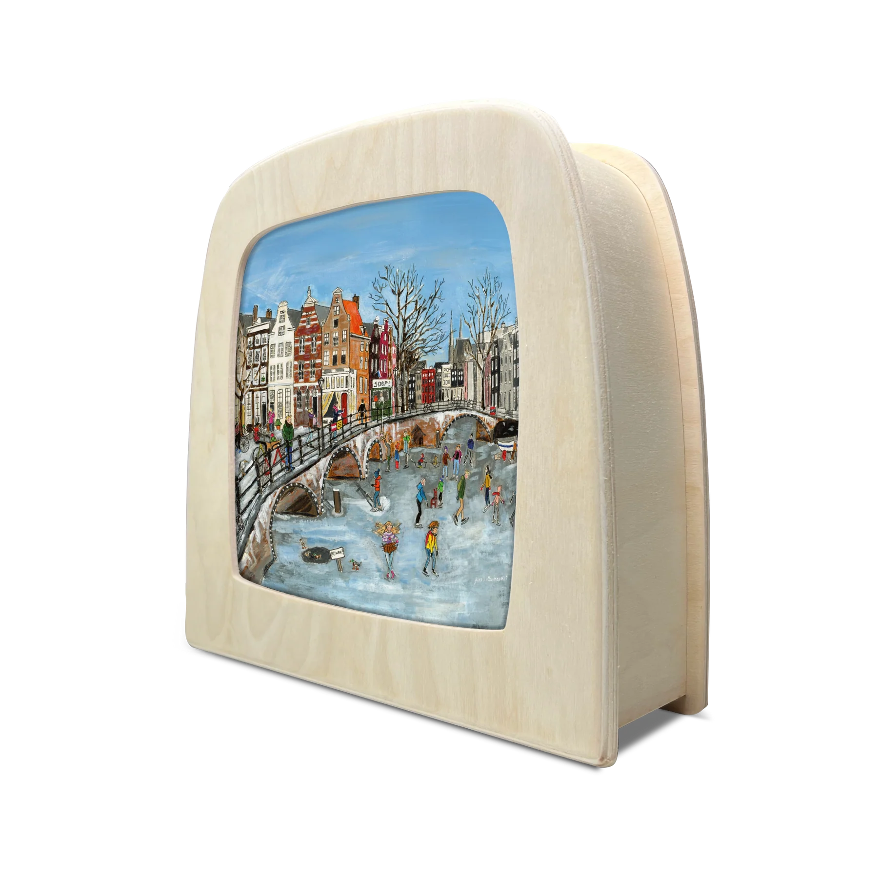 De sfeervolle illustratie van Gwen brengt het oer-Hollandse schaatsplezier tot leven alsof je zélf even over de gracht glijdt.