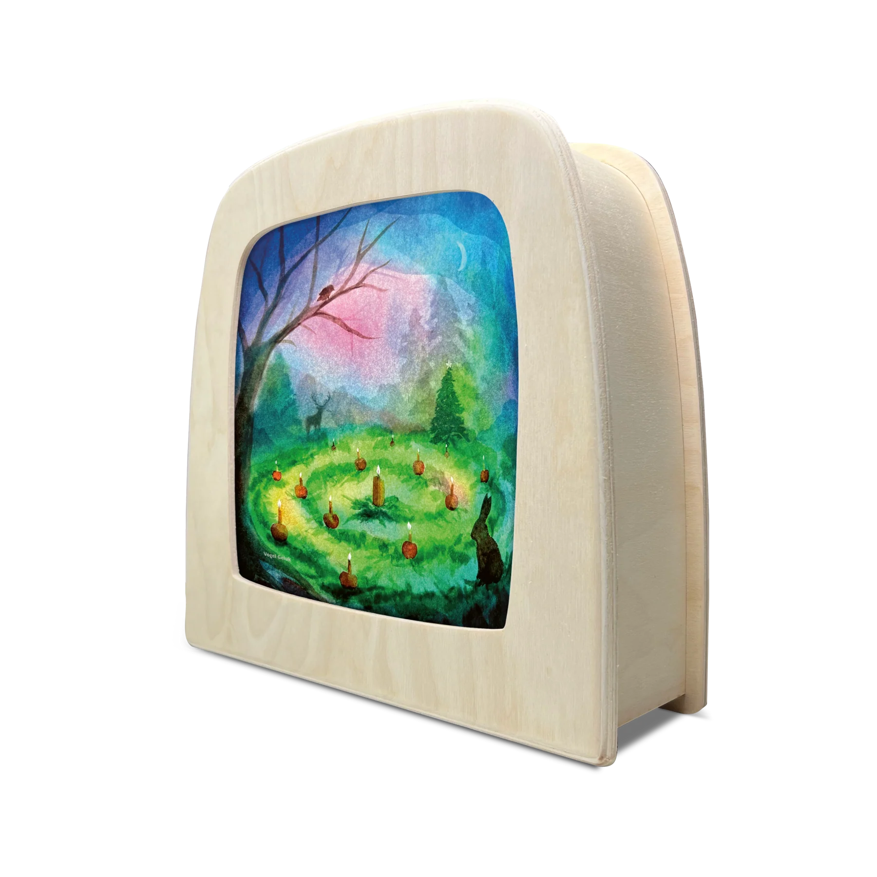 Wanneer het zachte licht van de Toverlux Lamp door deze Toverplaat schijnt, komt een sfeervol tafereel tot leven van de Adventstuin: een rustgevende scène vol lichtjes, groen en symboliek van hoop en verwachting.