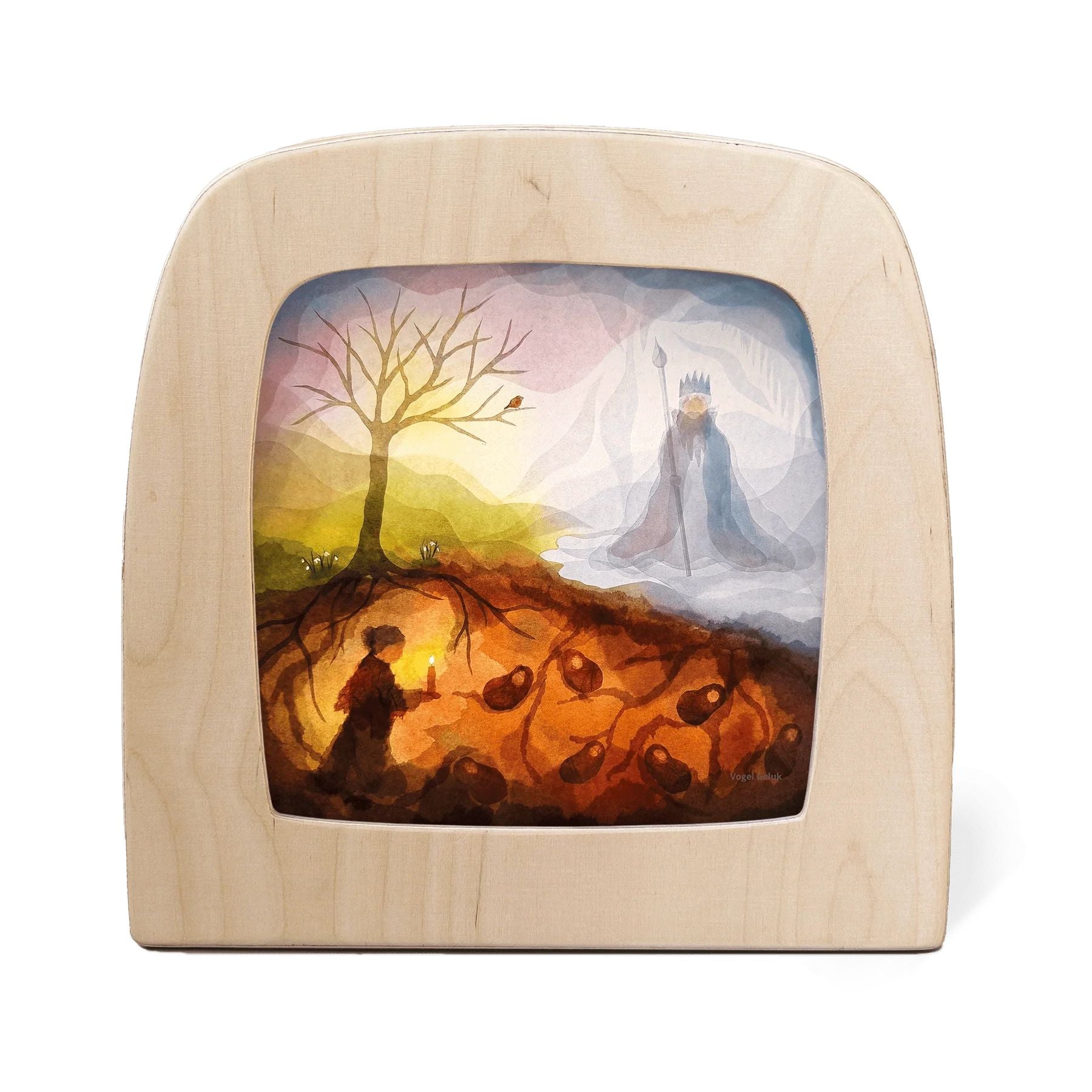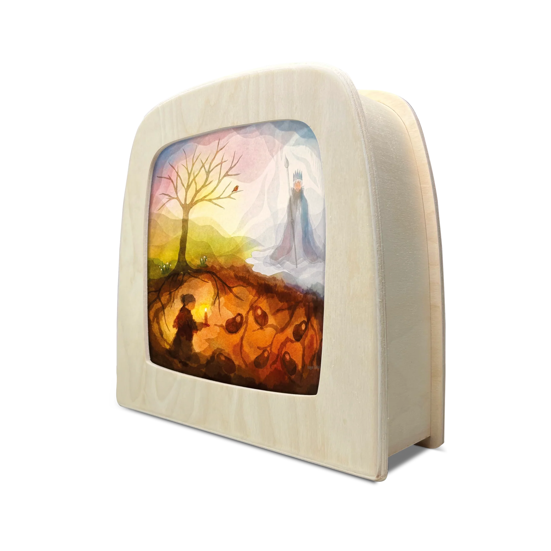 Wanneer het zachte licht van de Toverlux Lamp door deze Toverplaat schijnt, verschijnt een betoverend tafereel van de vogel Gaia die samen met majestueuze koningsfiguren een harmonieus en kleurrijk landschap tot leven brengt.