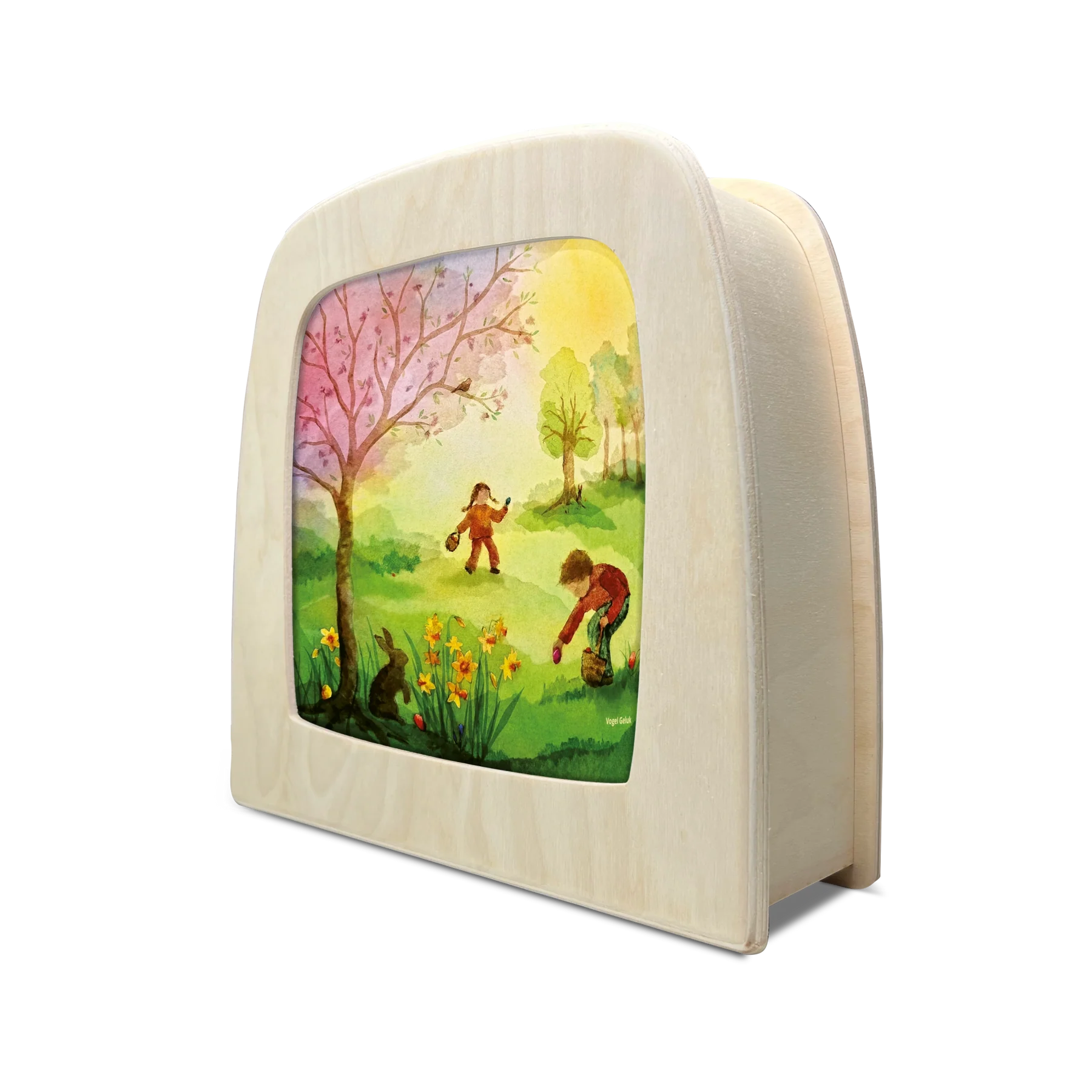 Wanneer het warme licht van de Toverlux Lamp door deze Toverplaat schijnt, verschijnt een betoverend tafereel van een vrolijke vogel die tussen paaseieren en lentebloemen op ontdekkingstocht gaat.