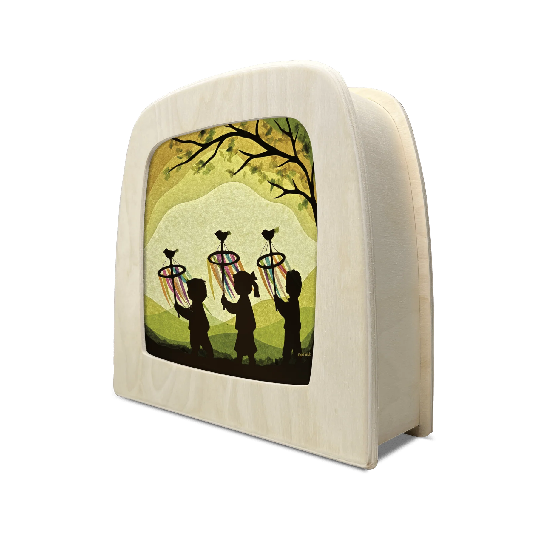 Wanneer het zachte licht van de Toverlux Lamp door deze Toverplaat schijnt, verschijnt een charmant tafereel van een gelukkige vogel die rond Palmpaasstokken en lenteversieringen fladdert.