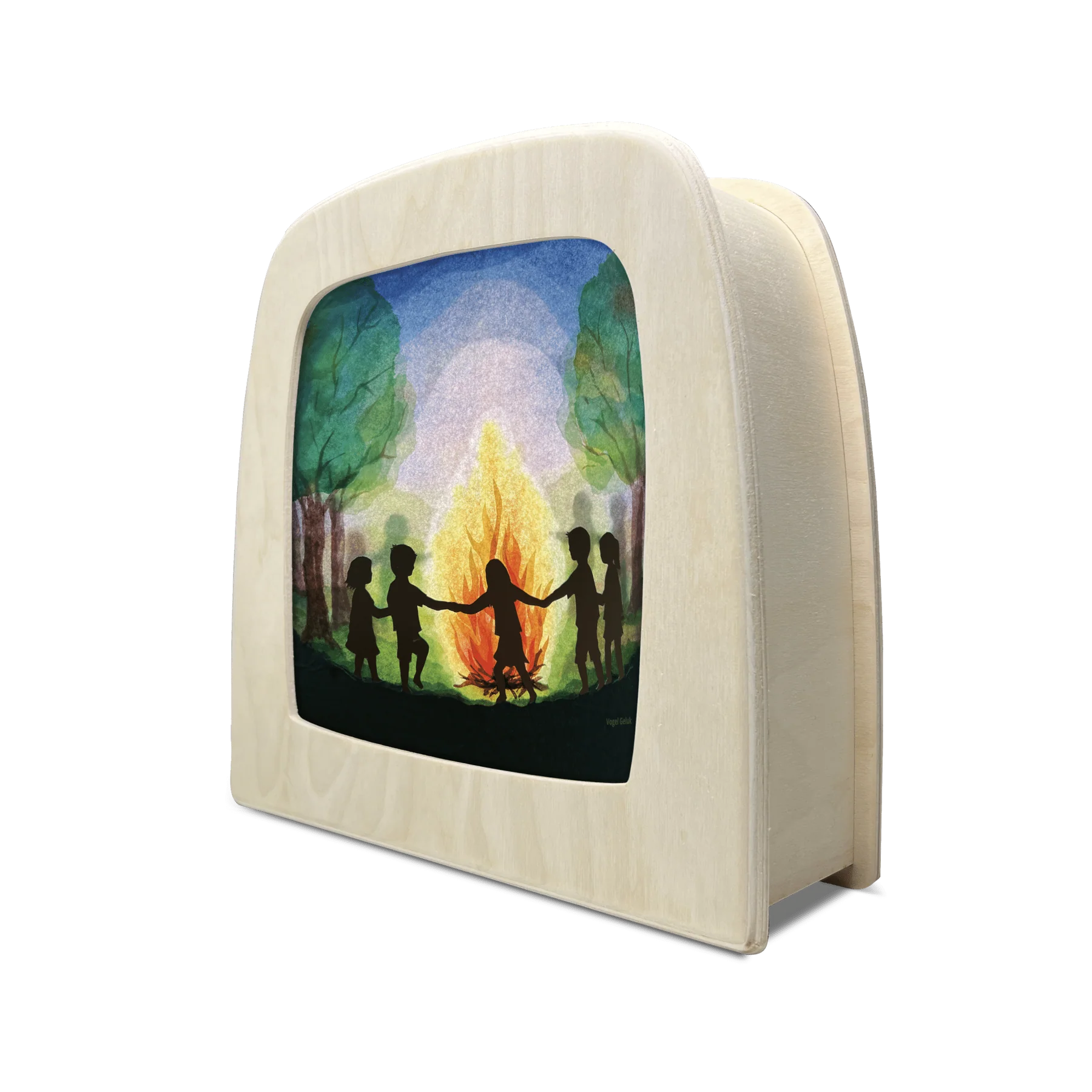 Wanneer het warme licht van de Toverlux Lamp door deze Toverplaat schijnt, verschijnt een betoverend tafereel van een vrolijke vogel die danst rond het St. Jansvuur.